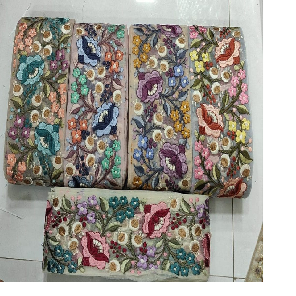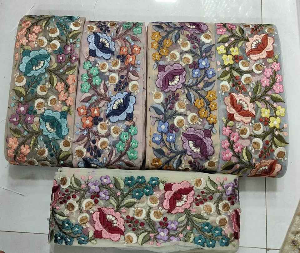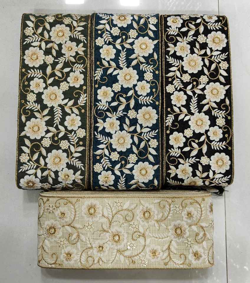 custom made floral embroidered in single colour in white coloured floral designs on black base fabric in 3 inch width size.