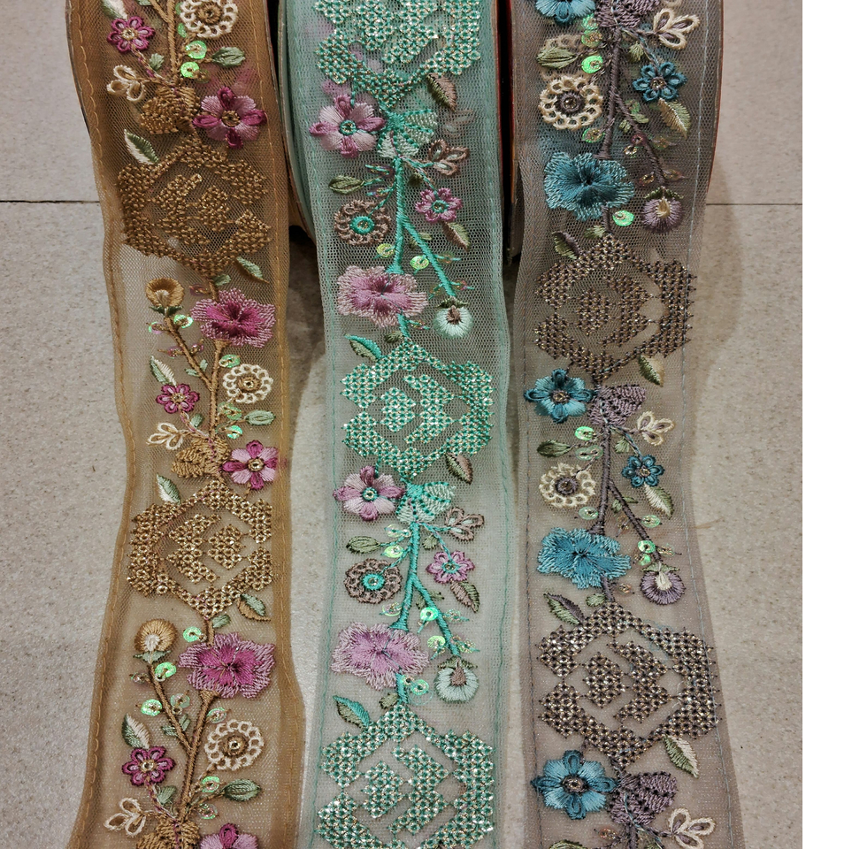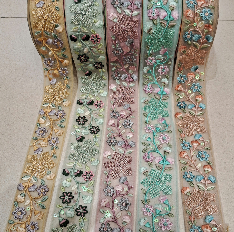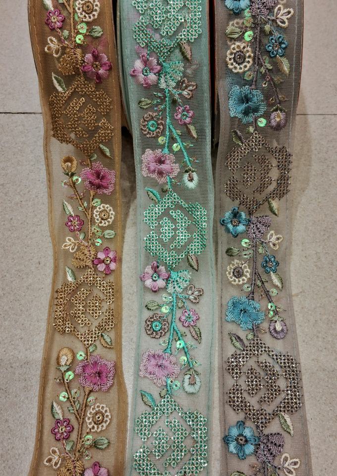 custom made floral embroidered in three colour ways in net fabric for dresses and garments in 1.5 inch width and resale.