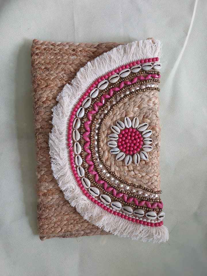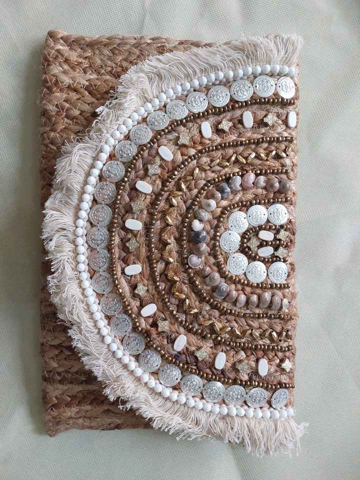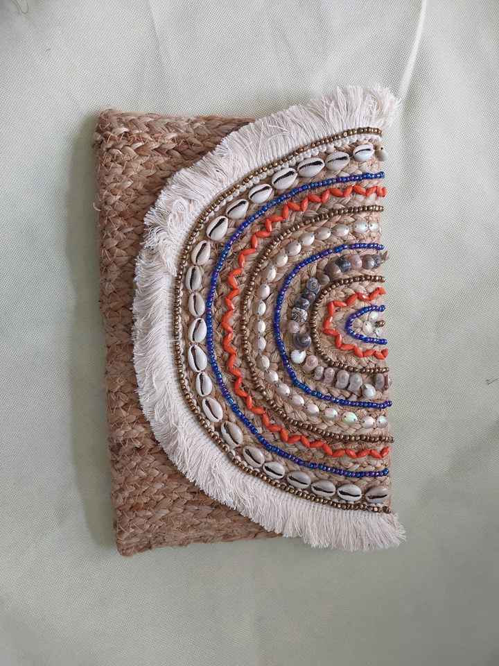 Custom Made in Blue & White Hand Jute Purses With Shell Trim and Cotton Fringe Trim for Fashion Accessory Stores and Bag Stores