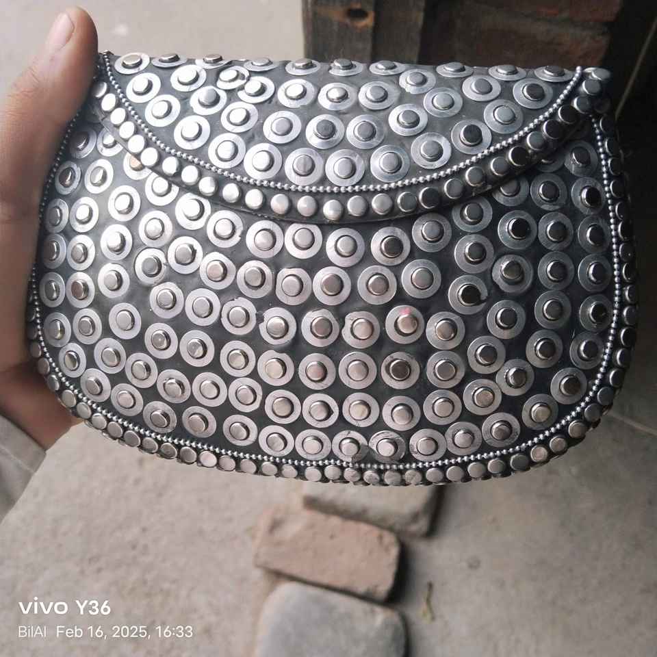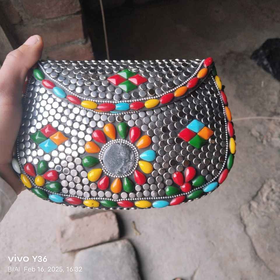 custom made multi coloured mosaic metal bags with resin mother of pearl glass and shell embellishments for resale