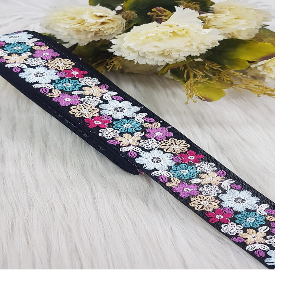custom made on black base fabric embroidered thread work laces with multi coloured options in 1.25 inch width for ladies garment