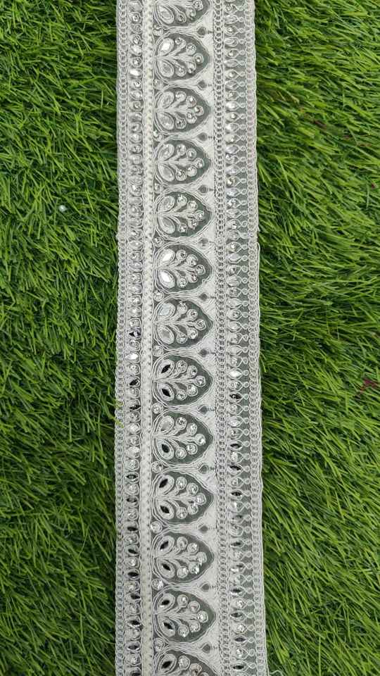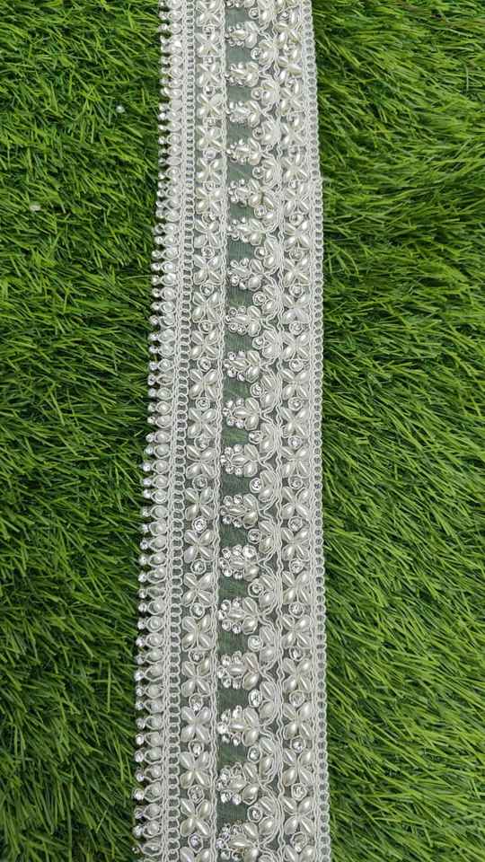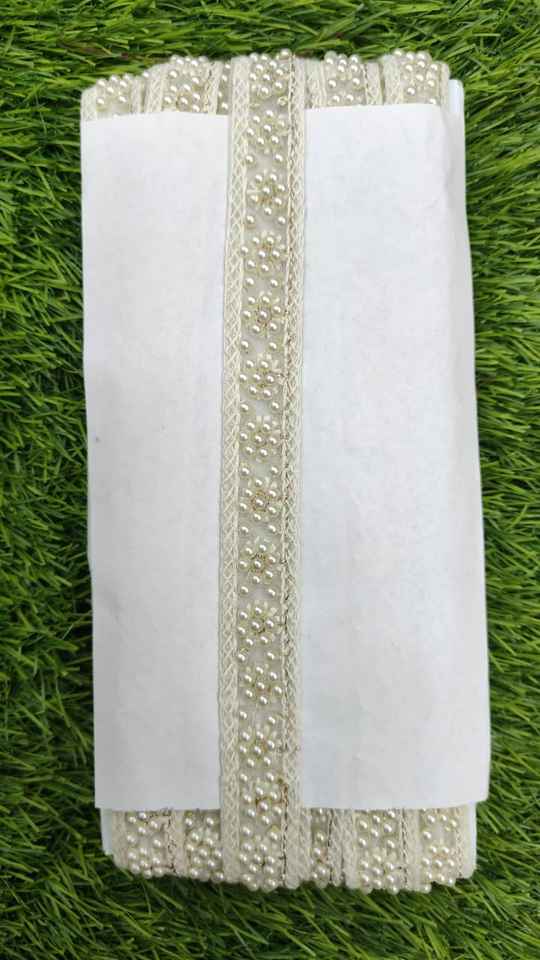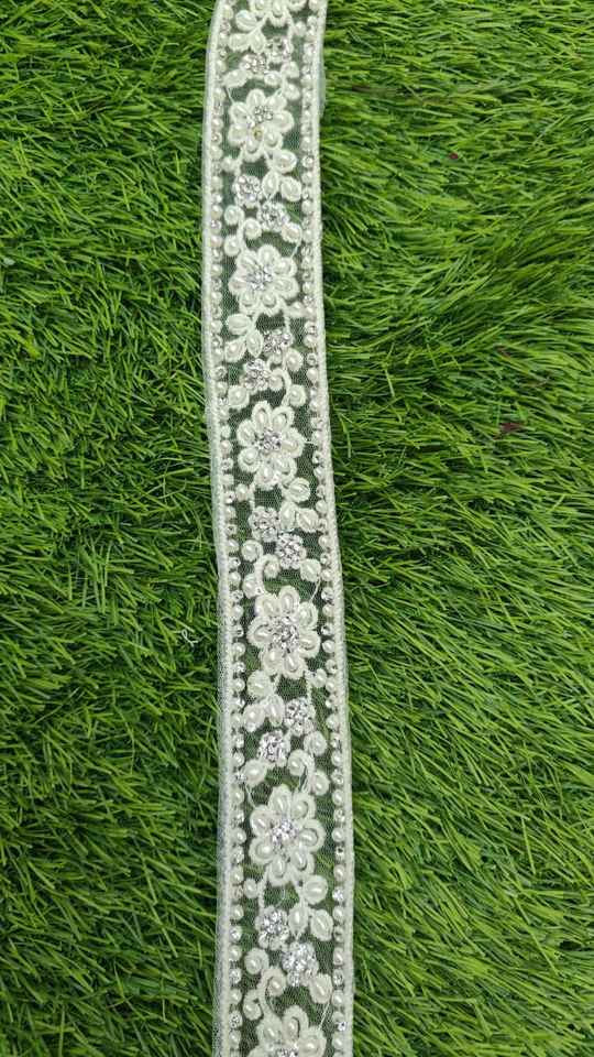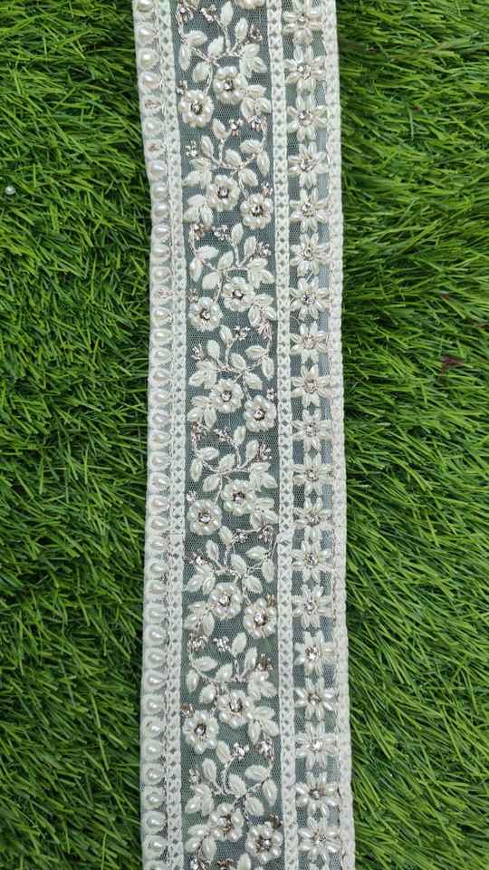 Custom Made White Base Fabric Machine Embroidered Ribbons & Laces in White Pearls for Wedding Dresses in 1 Inch Width