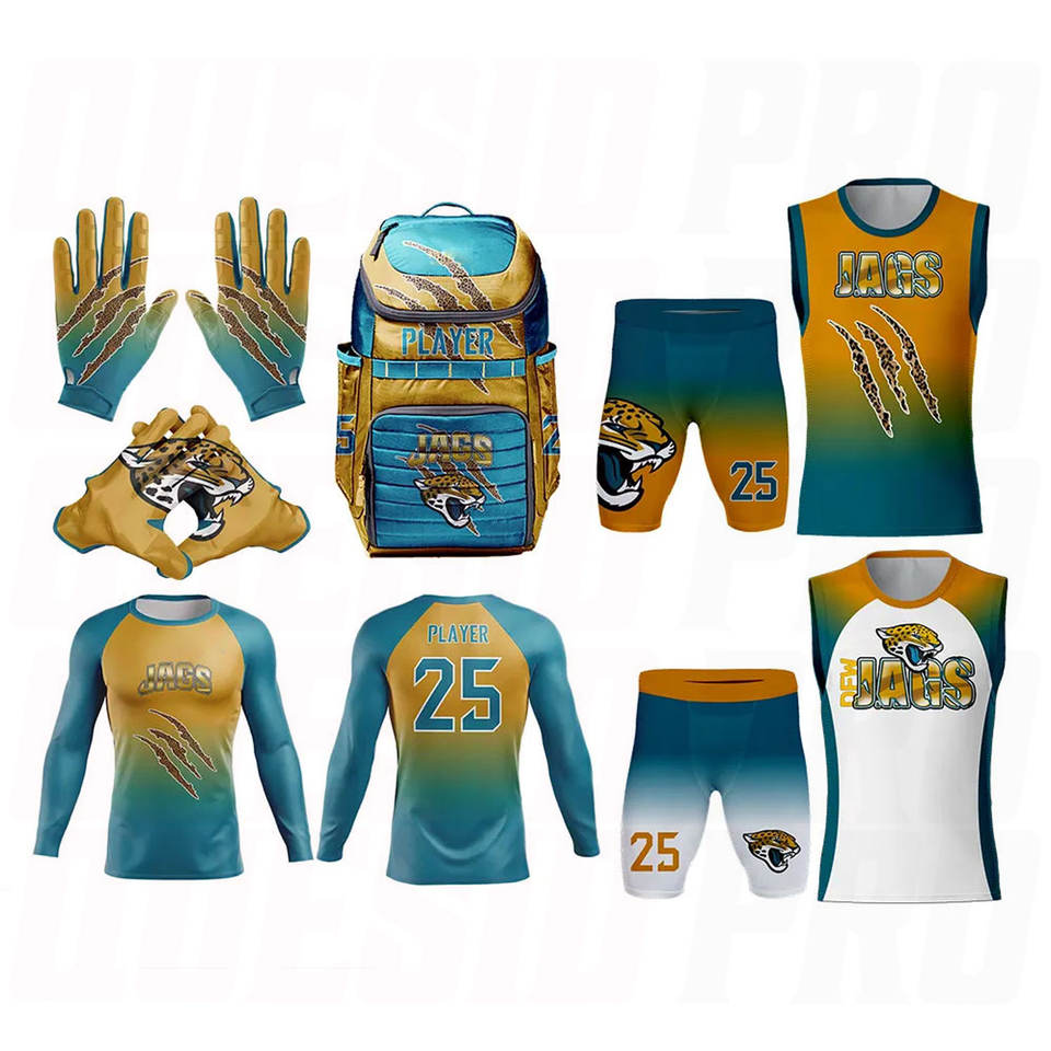customized club team 7v7 flag football sports wear deal packages uniforms, bags, gloves, compression shirts sublimation printing