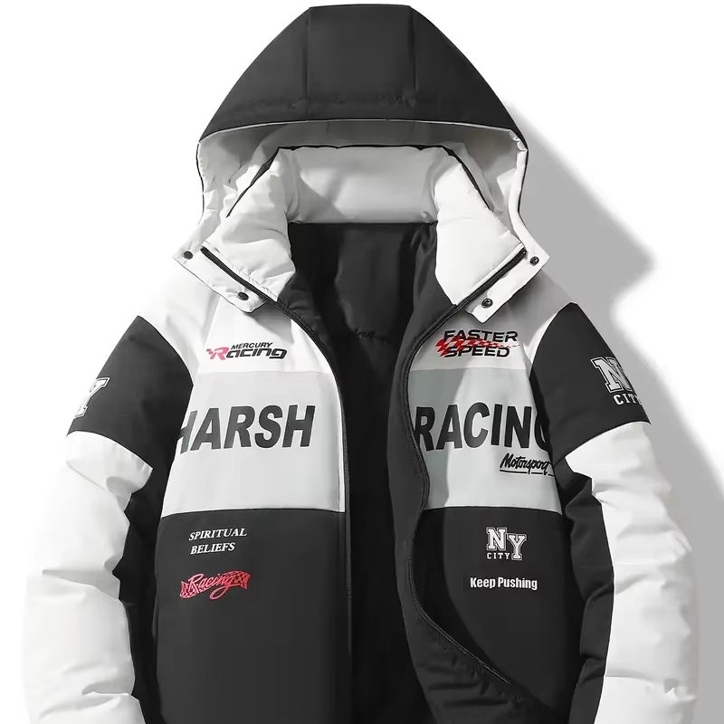 dropshipping Men'S Casual Polyester Jacket with Pattern, Long Sleeve Hooded Pilot Biker Coat, Regular Fit with Zipper Placket