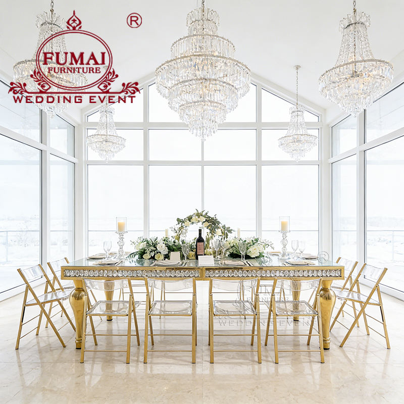 Exquisite Modern Wedding Party Rectangular Reception Table Transparent Glass Top Crystal Drops Decor Hotel Dining Outdoor Use