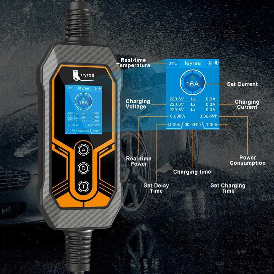 feyree Type 2 AC EV Charger with Adapter 11kW 16A WiFi APP Control with LCD Screen For Outdoor Use EVSE Portable EV Charger