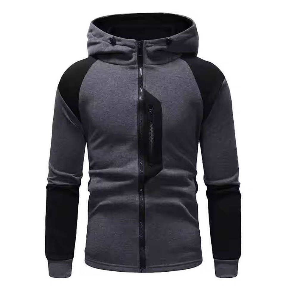 gray black men zip hoodie modern streetwear casual fashion sporty sweatshirt stylish contrast design lightweight active hoodie