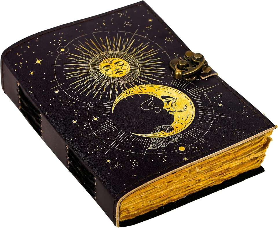 handcrafted diary features a stunning celestial design with an artistic Sun & Moon illustration embossed on a deep black leather
