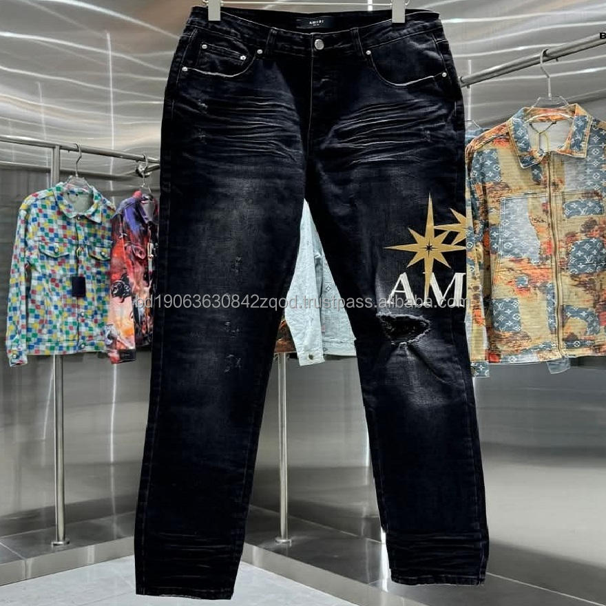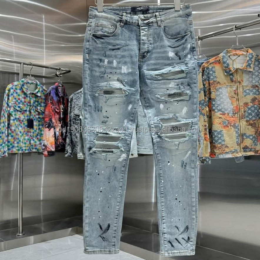 High Quality Mid Waist Slim Fit Men's Jeans Casual Street Pants Ripped Denim Stickers Blue Washed Cotton for Spring Autumn-Stock