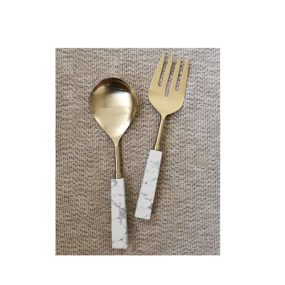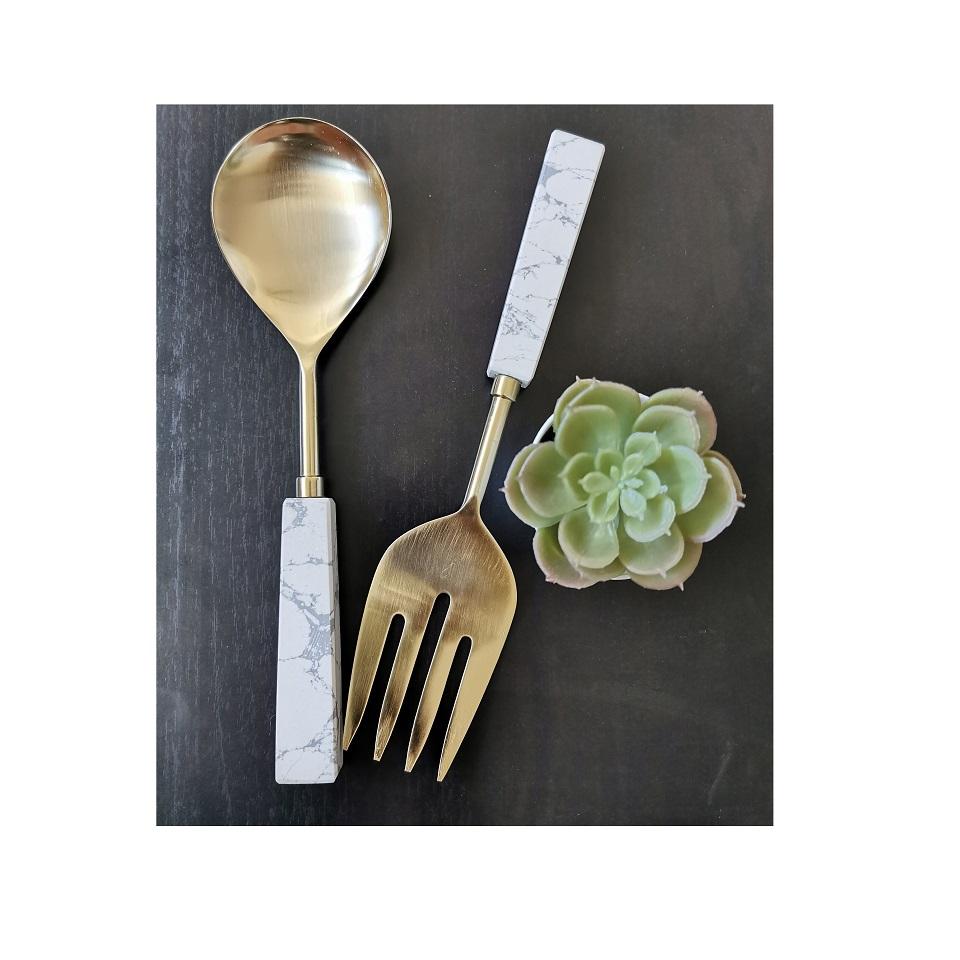 Hot Sale New Arrival Decorative Metal Gold Salad Server Handmade Marble Handle Salad Spoon and Fork Home Kitchen and Restaurant