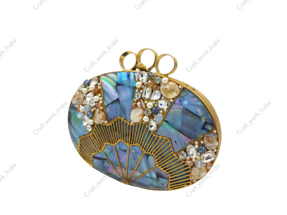 indian Luxury Mother of Pearl Oval Clutch with Triple Ring Handle Handcrafted Brass Frame Evening Party Statement Bag