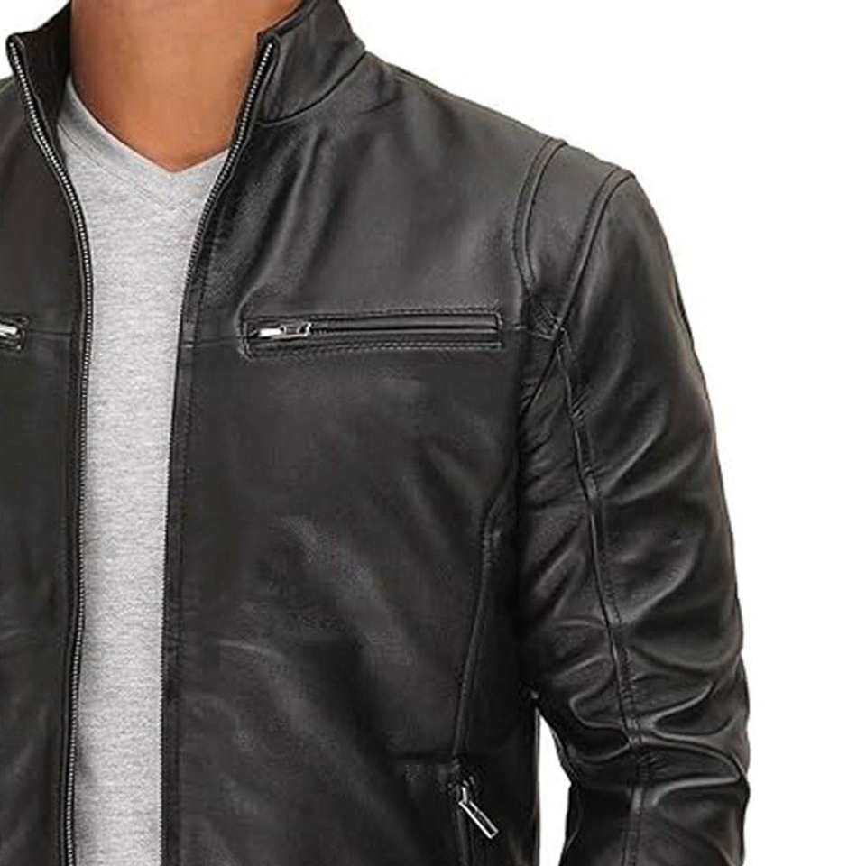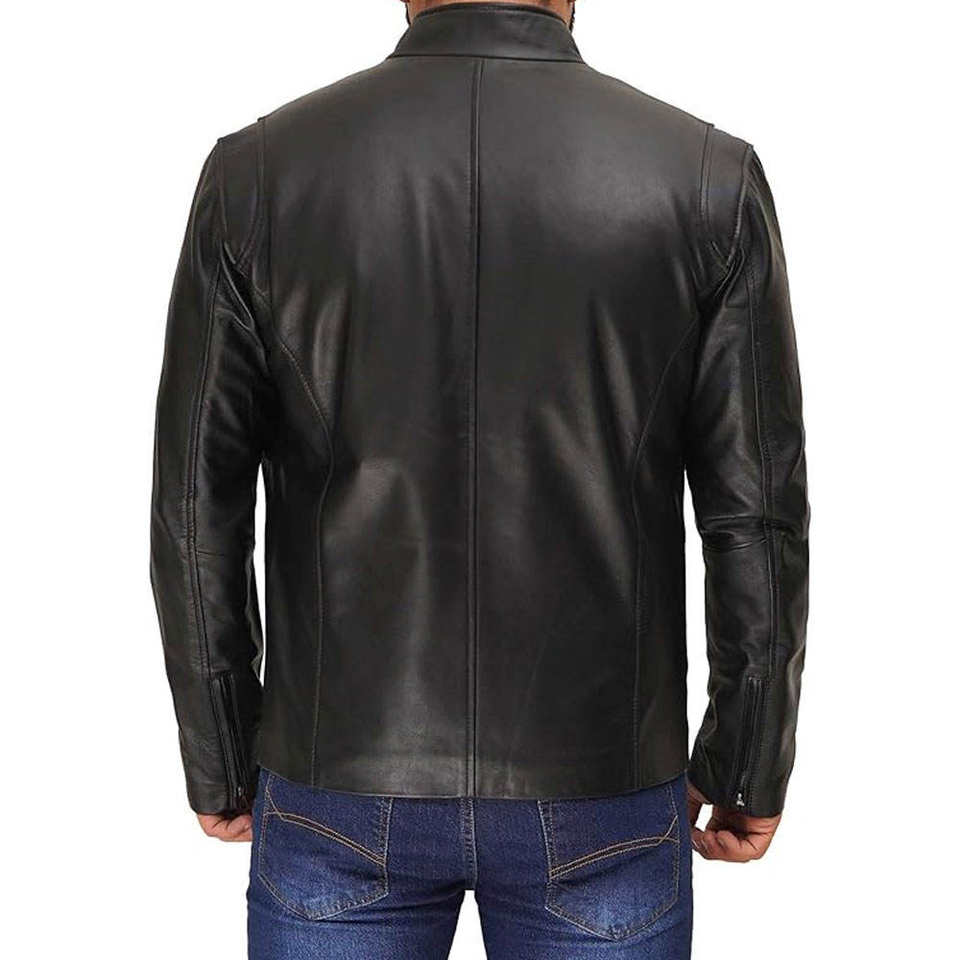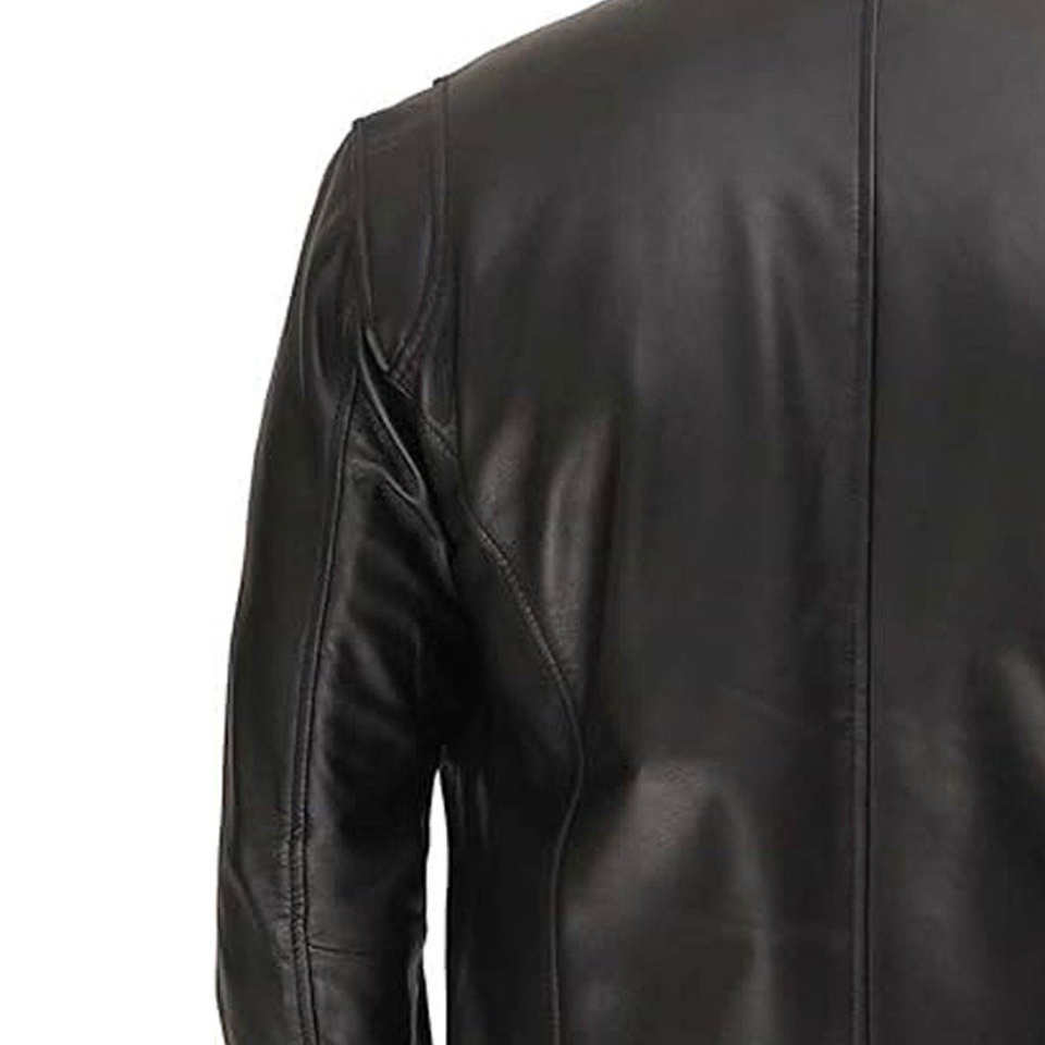 Men's Sheepskin Leather Motorcycle Jacket with Stand Collar and Front Logo Windproof Sherpa Lining OEM Custom Service