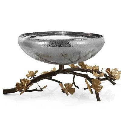 japaneseSilver Stainless Steel Shiny Polished Handmade Dinnerware Bowl Gold Color Color Leaf Design Stand Serving Tableware