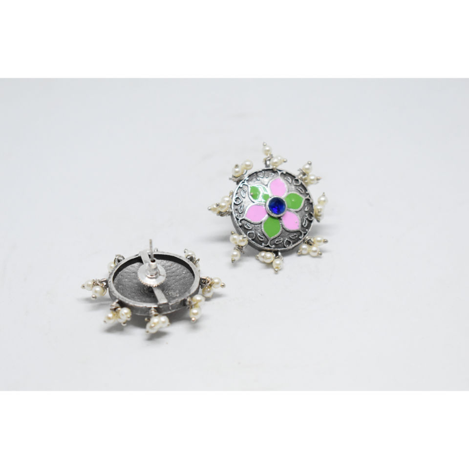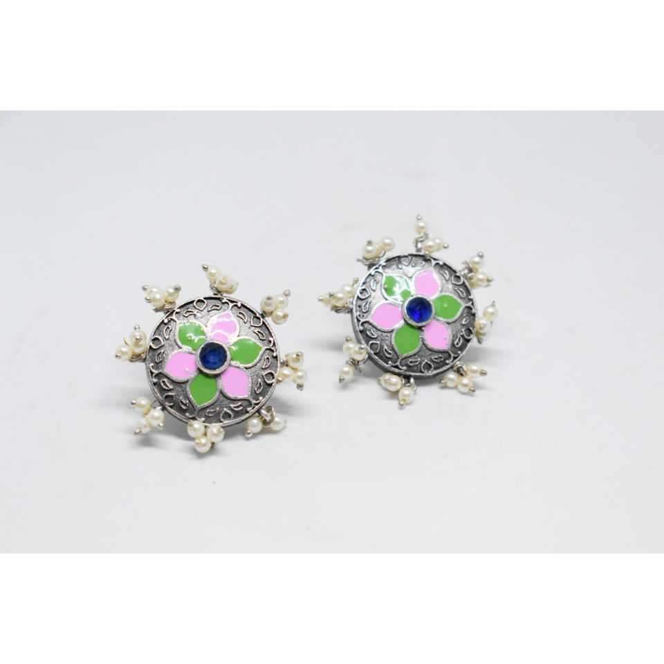 latest western design fashionable trending meenakari silver look alike brass hoop flower round stud earing for girls and women