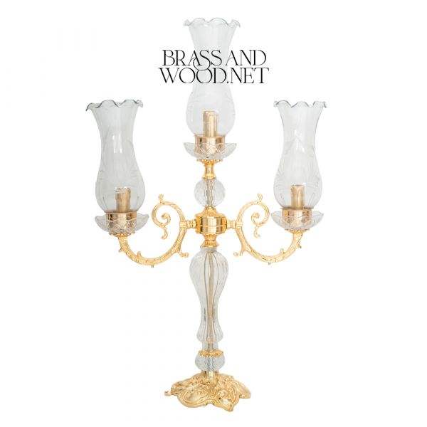 luxury gold brass and crystal three arm candelabra with glass shades elegant vintage style handcrafted decorative candle holder