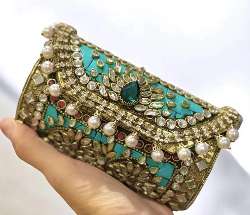 metal clutch purse bag Handcrafted Bridal Clutch Bag with Kundan Stones & Pearl Handle Ethnic Designer Purse for Wedding & Party