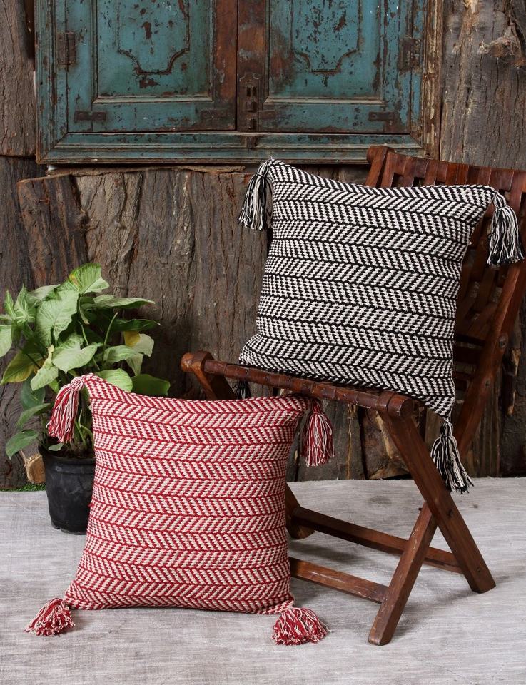 Set 2 Red Khadi Cotton Handwoven Chevron Pattern Reversible Cushion Covers 18x18 Inches Decorative Pillowcases Super Soft Home