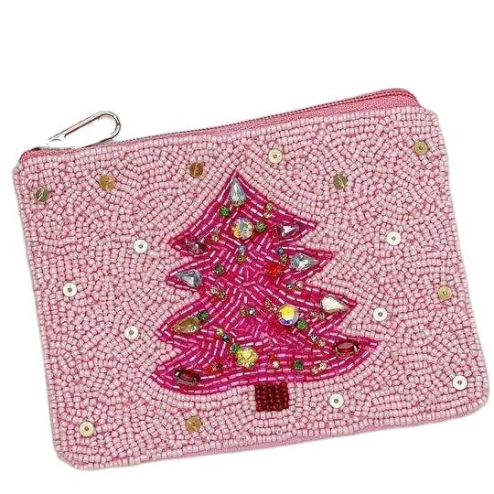 pink Christmas Beaded Pouch Christmas Seed Bead Coin Purse Fuchsia Tree Merry Christmas Coin Purse Gifts Holiday