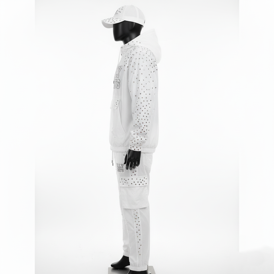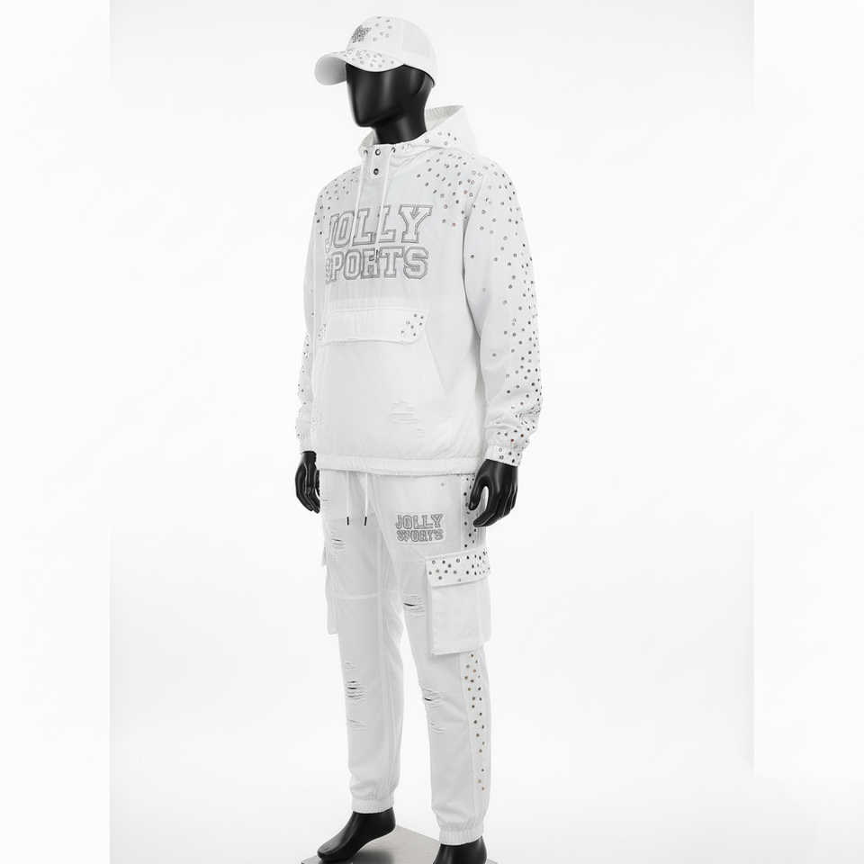 plus size Premium Polyester White Windbreaker Set Distressed Fabric with Rhinestone Panel Design Embroidery Windbreaker Set
