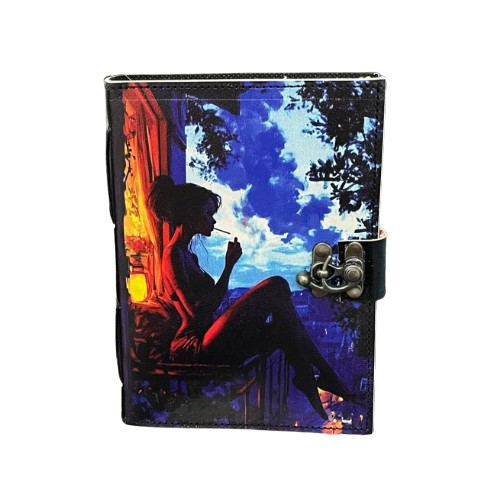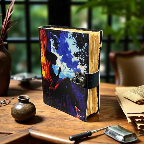 printed Artistic Leather Journal Blank Spell Book of Shadows Woman Silhouette Window Design Vintage Lock Hardcover Diary