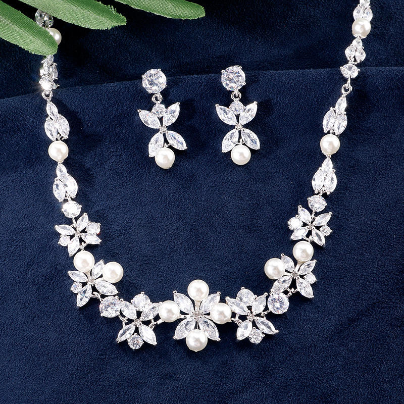 rakol SP454 Romantic Zircon Imitation Pearl Flower Earrings Necklace Set Bride Women Jewelry Wedding Evening