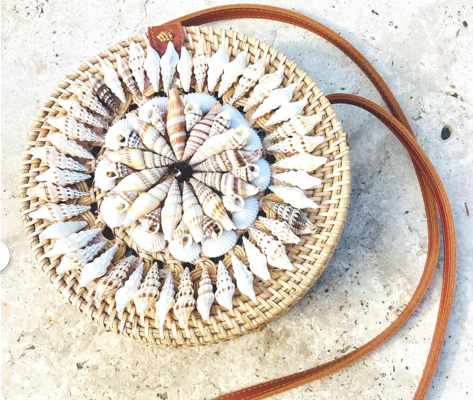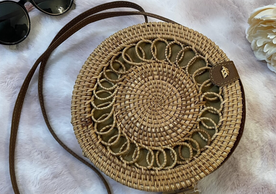 Round Pentagram Women's Handbags Handmade Rattan Bag with Shoulder Leather Straps Natural Chic Handbag