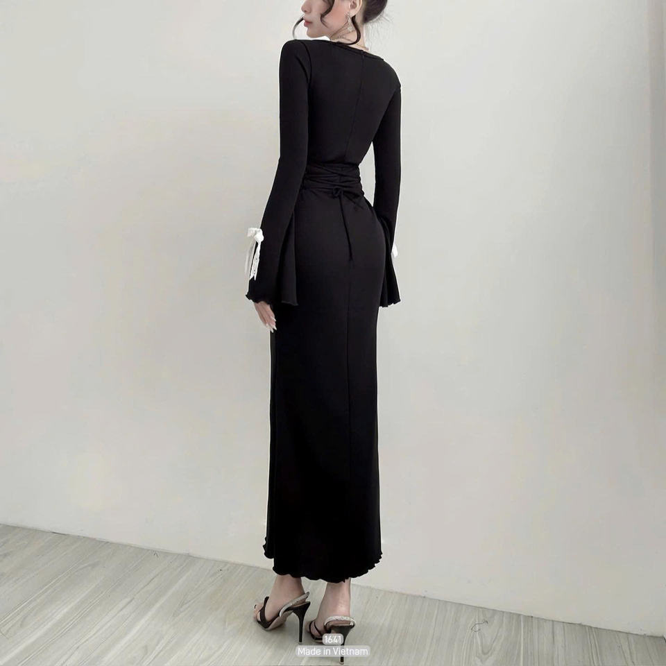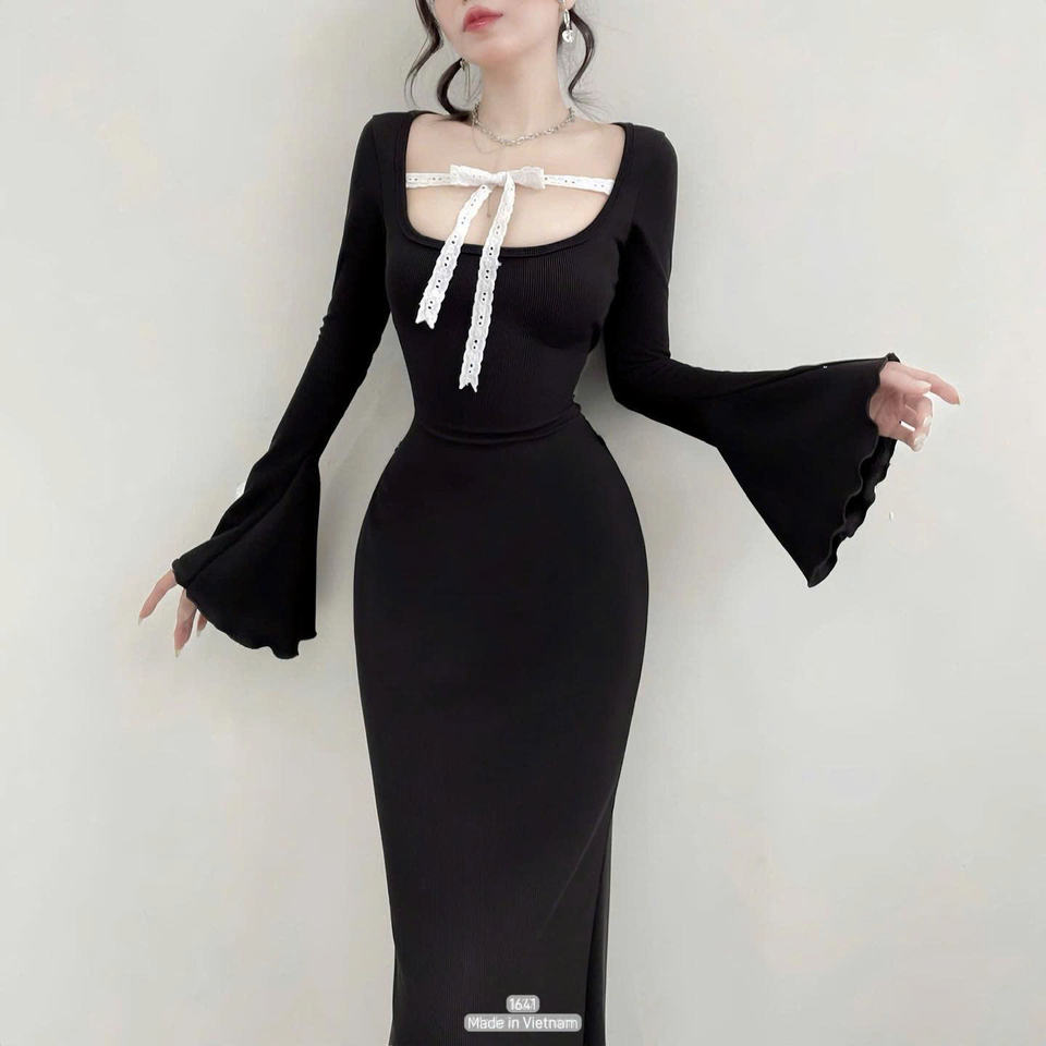 [sewing Factory] DR169 Midi Spandex Ribbed Elastic Fabric Flared Sleeves Lace Bow Formal Customized According Customer