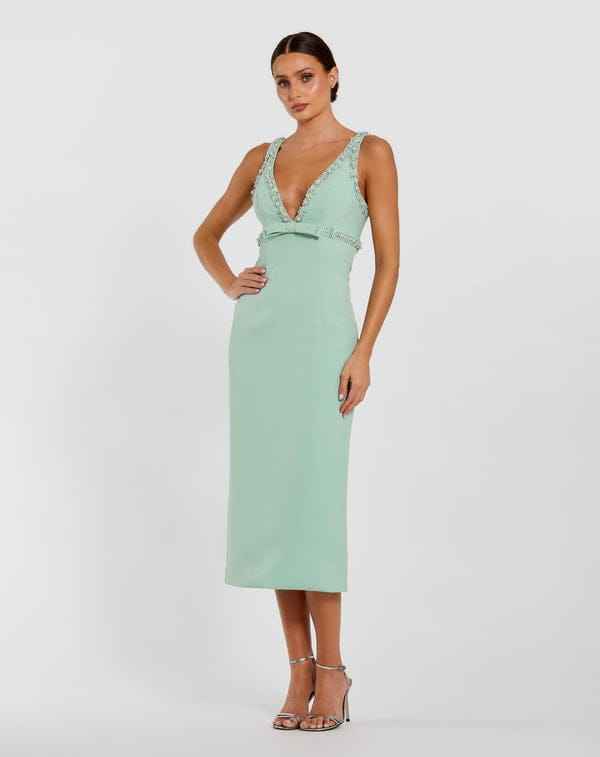 Sleeveless O-Neckline Crepe Straight Natural Waist Prom Dress Mini Evening Wear Embellished Flower Belt Back Cowl Detail Beaded