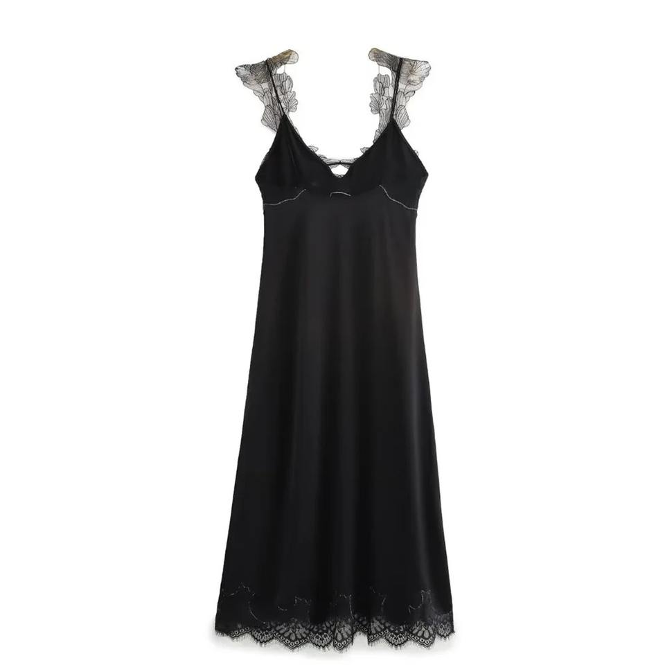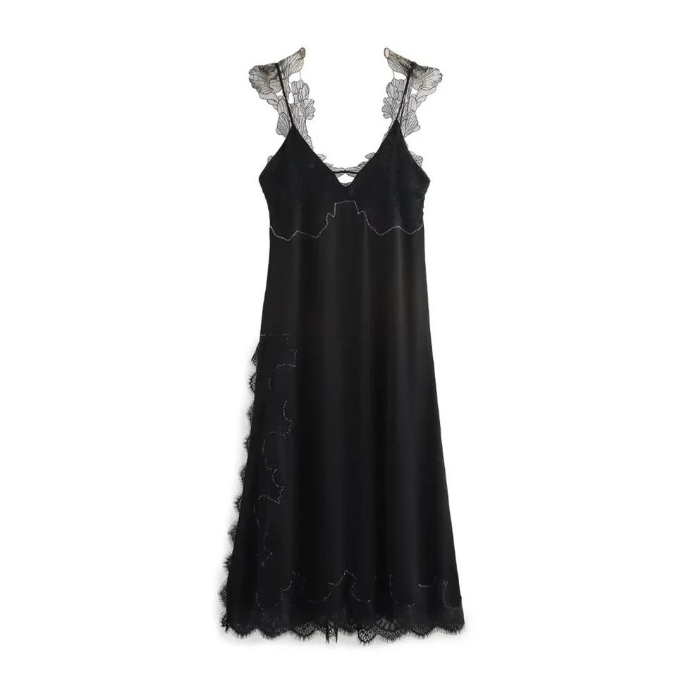Summer New Women's Fashionable Temperament V-neck Sleeveless Solid Color Lace Trimmed Slim and Sexy Suspender Dress