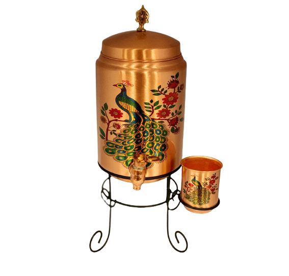 top Custom Peacock Printed Design Copper Water Dispenser with Glass Set Wholesale Manufacturer and Exporter at Low Price