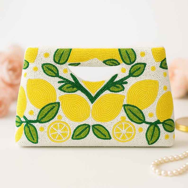 vLemon Beaded Bag, Purse Lemon Beaded Lemon Clutch, Yellow Lemon Summer Vacation Purse, Unique White Beaded Clutch Lemon