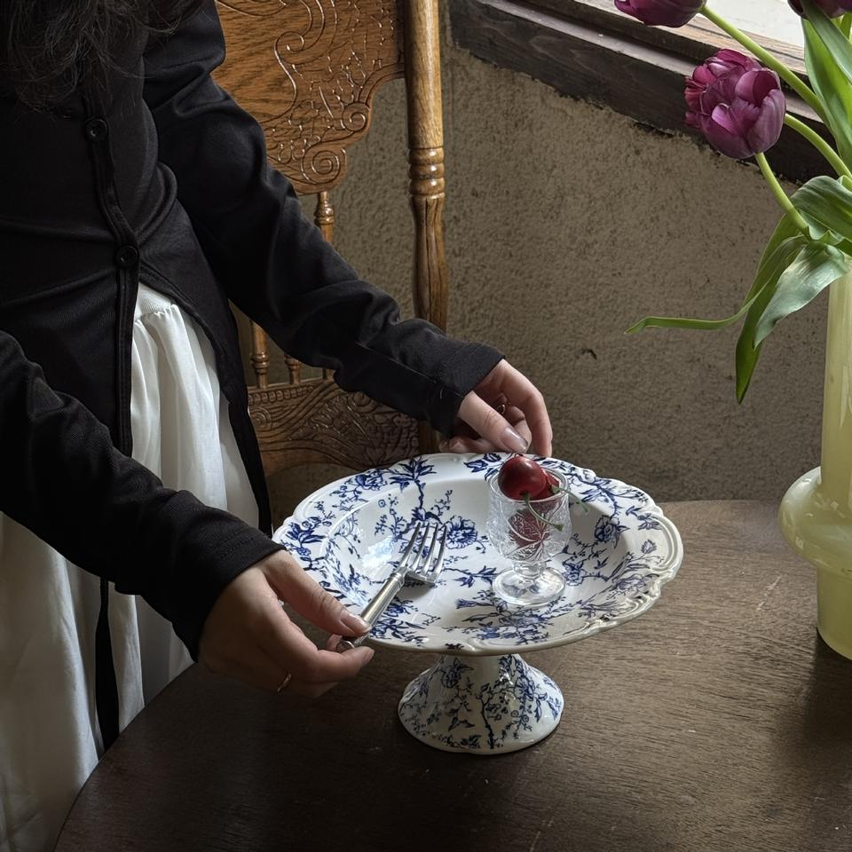 vintage French vintage lace blue and white ceramic cups and plates, vintage blue floral latte cups, afternoon tea set
