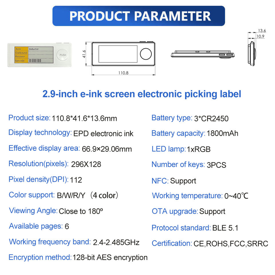 Product name:2.9 inch e ink screen black/white 4 color electronic picking label