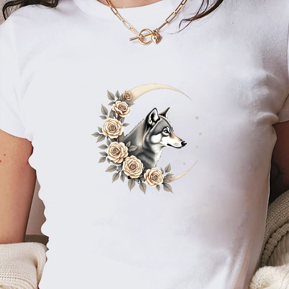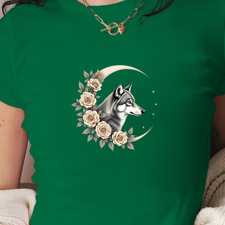 Wolf Head with Crescent Moon Print Women's Y2K Style Slim Fit Short T-Shirt Fashion Knitted Fabric