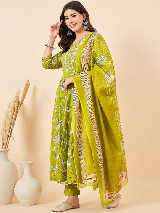 women Floral Printed V-Neck Sequined Pure Cotton Kurta with Trousers & With Dupatta indian pakistan salwar kameez suit