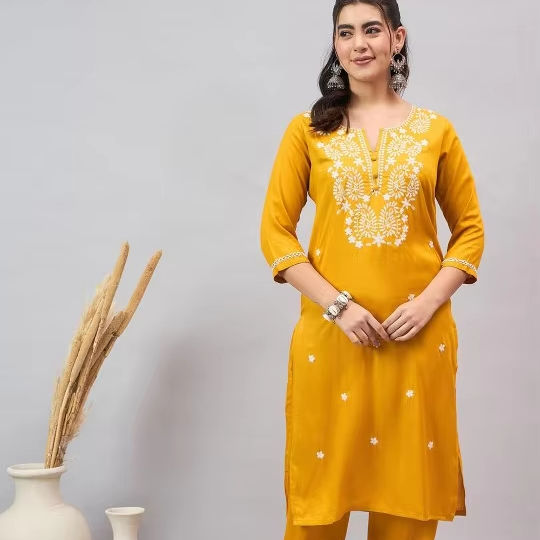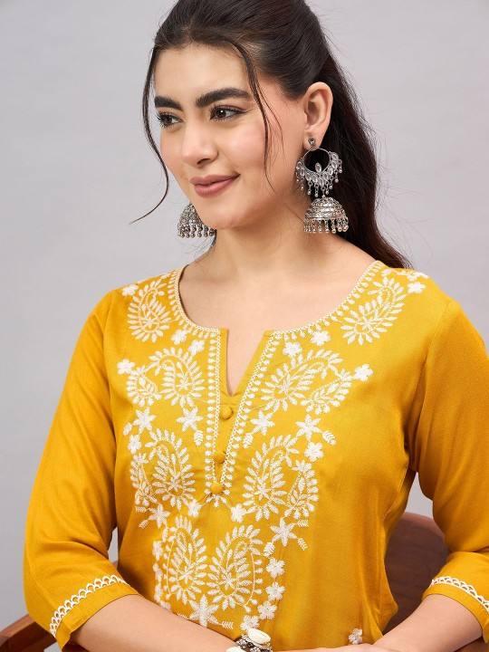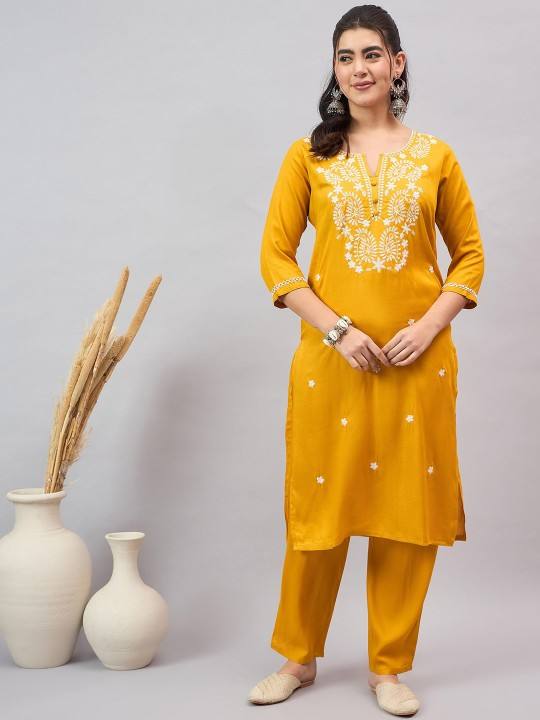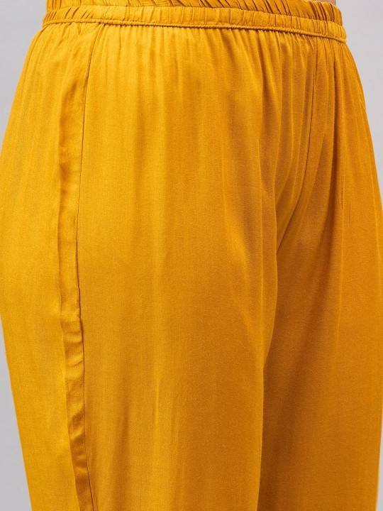 women Mustard Paisley Embroidered Notch-Neck Straight viscose rayon Kurta With Trouser indian pakistan salwar kameez