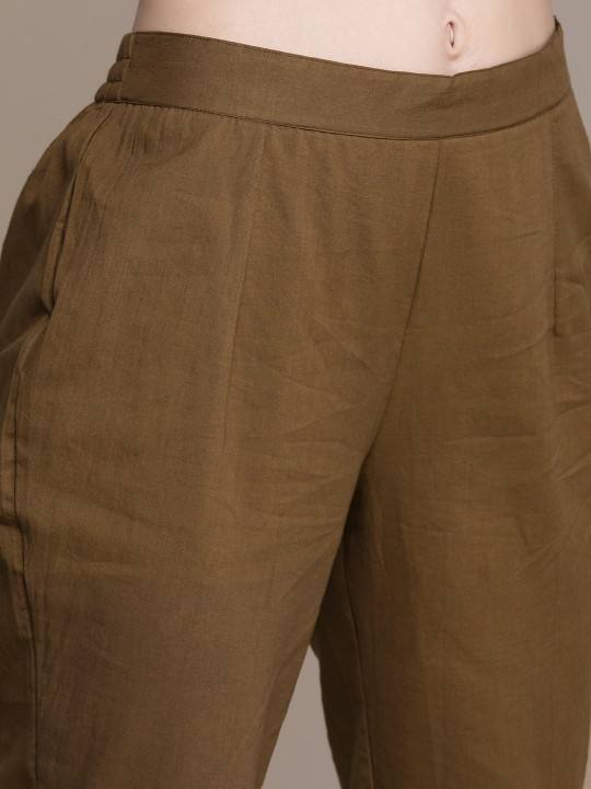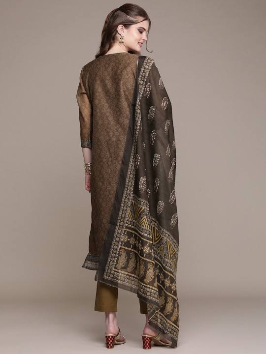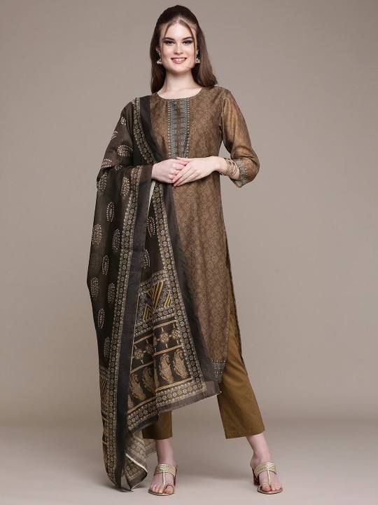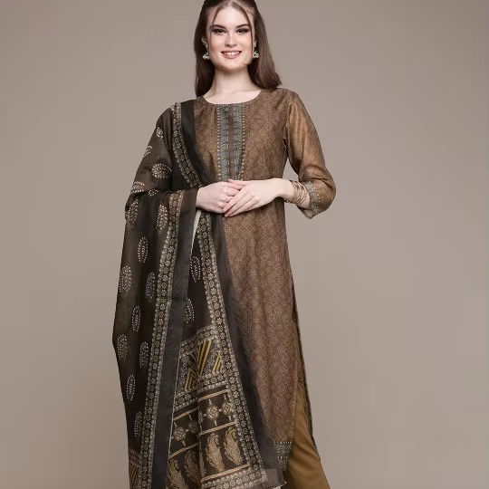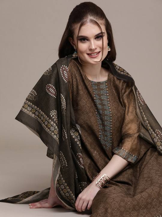 women ethnic Brown Ethnic Motifs Printed poly chaderi Kurta with Trousers & Dupatta indian pakistani salwaar kameez suit