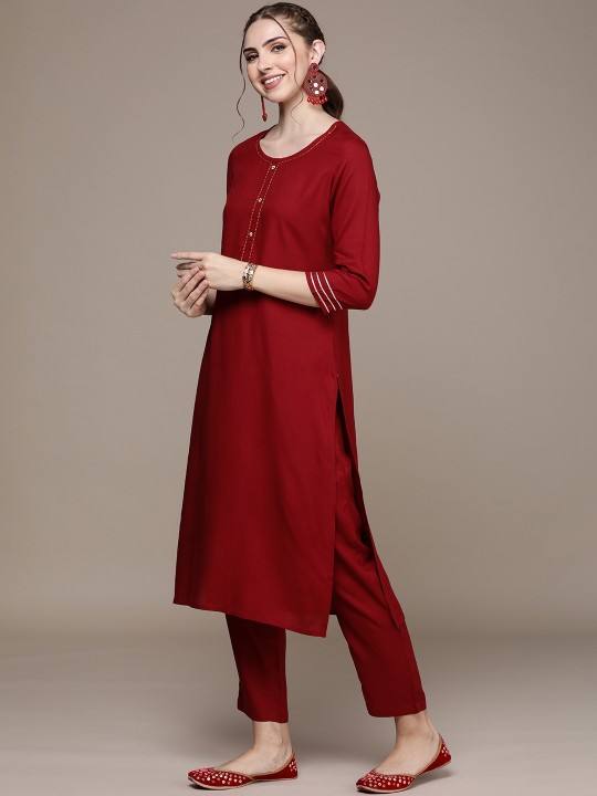 women ethnic Embroidered Kantha Work viscose rayon Kurta With Trousers & Tussar Silk Dupatta indian pakistan salwar kameez