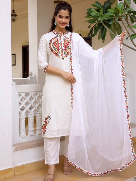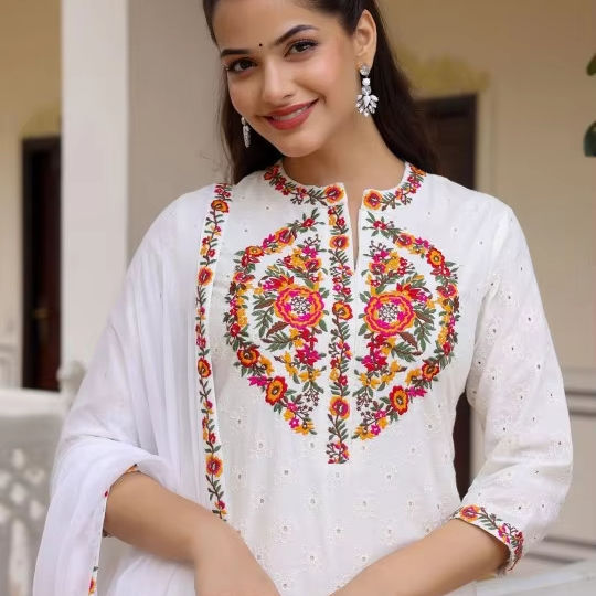women ethnic Floral Embroidered Pure Cotton Kurta with Trousers & Dupatta indian pakistan salwar kameez suit