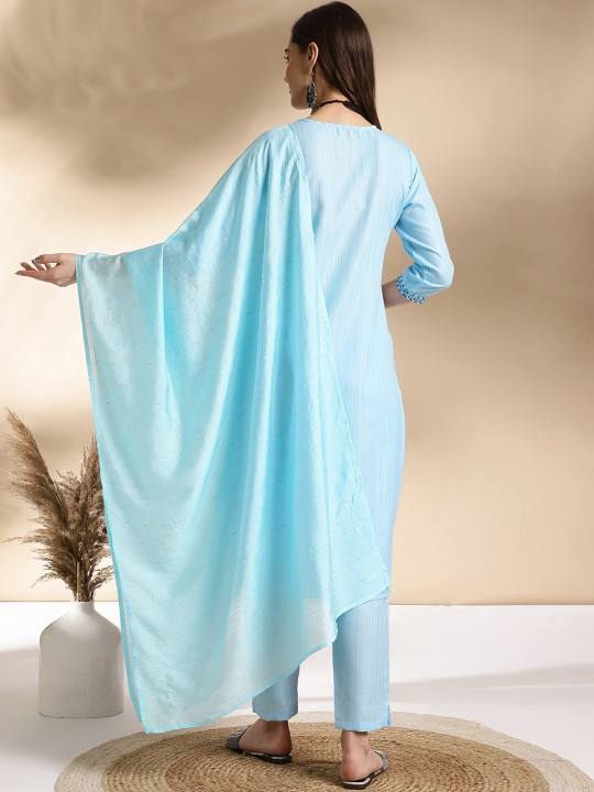 women ethnic Floral Embroidered Regular Thread Work Straight Kurta with Trousers & Dupatta indian pakistan salwar kameez