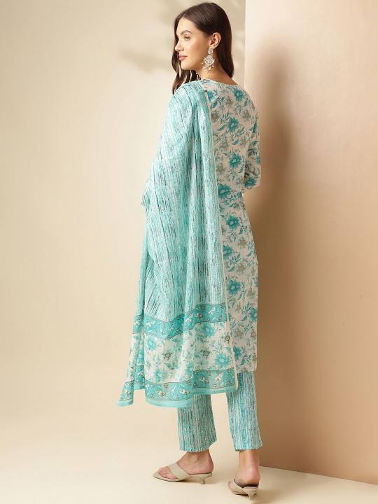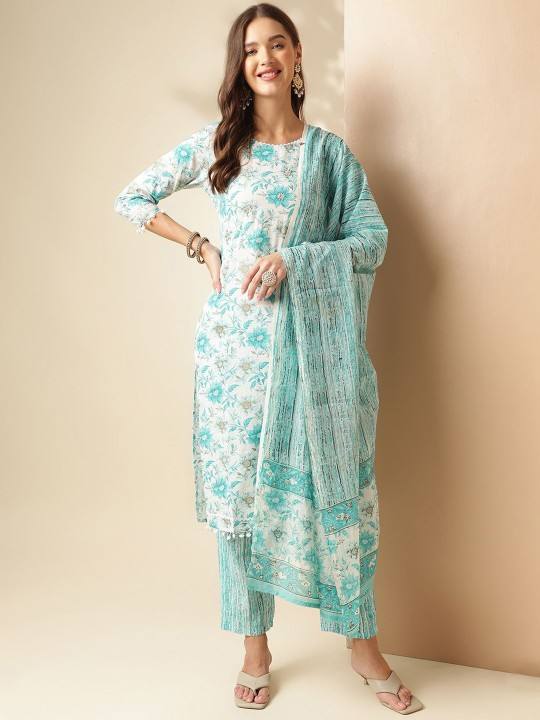 women ethnic Floral Printed Round Neck Pure Cotton Straight Kurta With Trouser With Dupatta indian pakistani salwaar kameez suit
