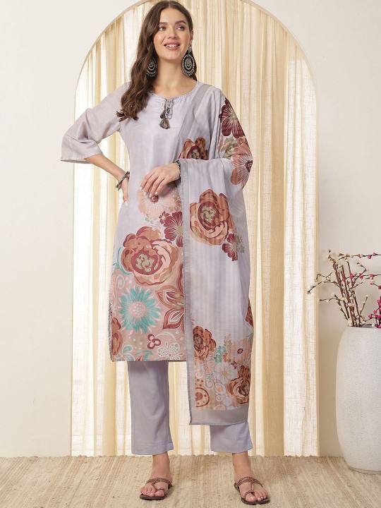 women ethnic Mauve Floral Printed Tie-Up Neck Pure Silk Straight Kurta With Trousers & Dupatta indian pakistan salwar kameez