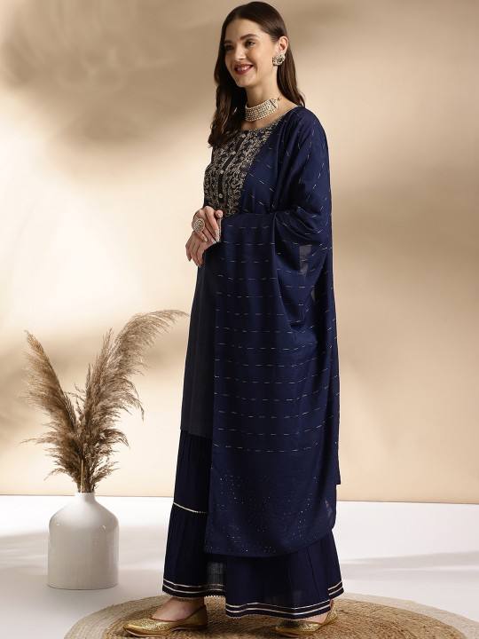 women ethnic Motifs Embroidered Round Neck Straight pure cotton Kurta with Sharara & Dupatta indian pakistani suit