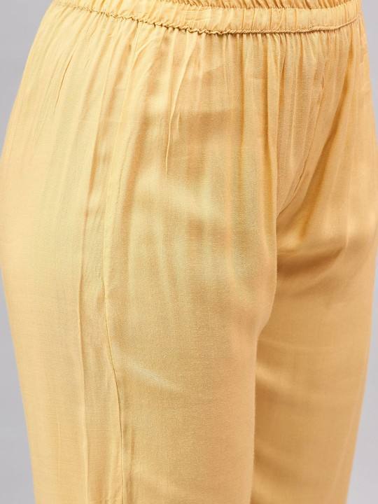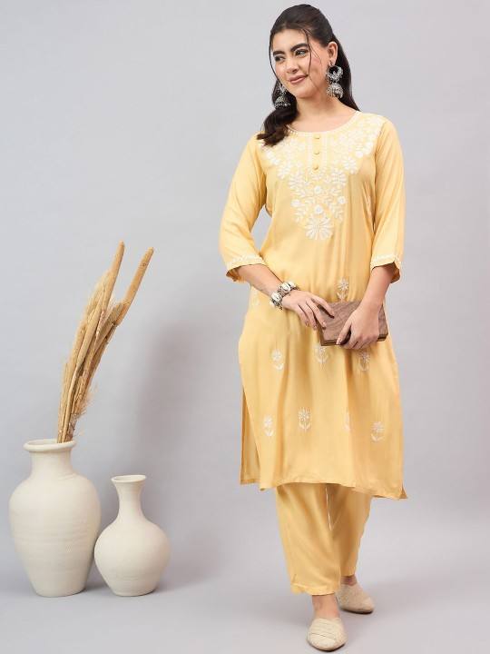 women ethnic Yellow Ethnic Motifs Embroidered Round Neck viscose rayon Kurta With Trouser indian pakistan salwar kameez