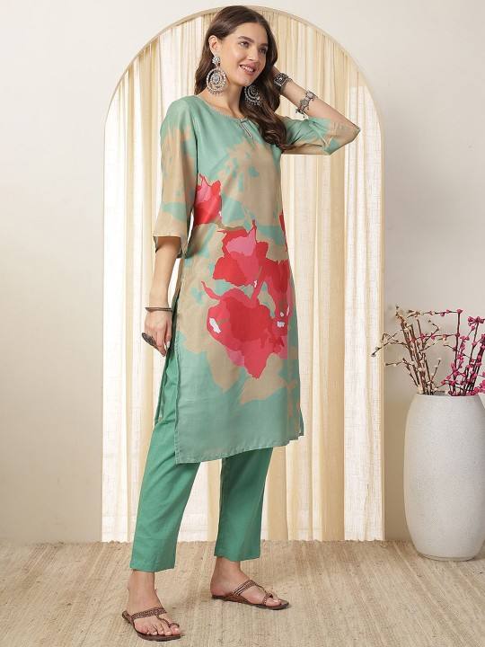 women green floral printed Keyhole Neck Pure Silk Straight Kurta With Trousers & Dupatta indian pakistan suit