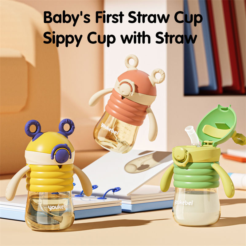 youkebei OEM Factory BPA Free 300ml Baby Milk Bottle Sippy Cup with Donut Bouncing PCT Learning Cup Soft Glass for Feeding